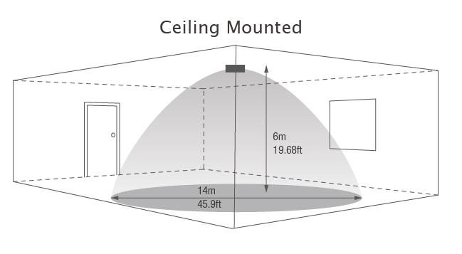 Jangkauan deteksi | Maks. 14m (dipasang di langit-langit), Maks. 10m (dipasang di dinding) |