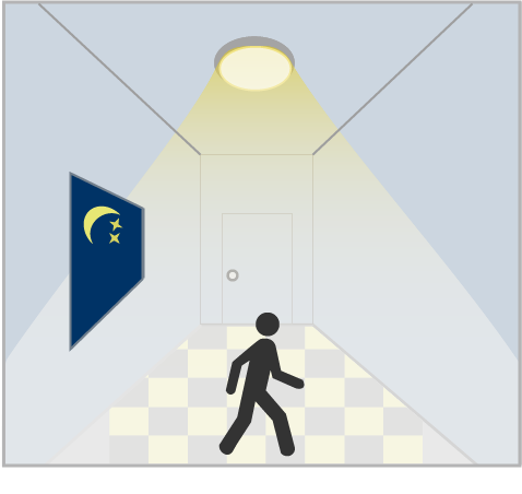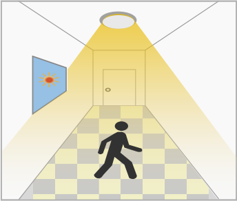 Lampu menyala saat mendeteksi gerakan dan mati setelah orang meninggalkan rumah pada malam hari.Aplikasi:Koridor,Tangga.Ambang batas cahaya siang hari diatur ke "2Lux,10Lux,50Lux".