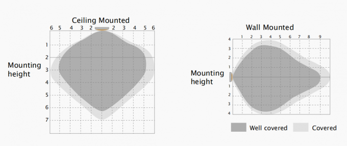 Perlengkapan menunjukkan jarak maksimum pada ketinggian pemasangan tertinggi dengan sensitivitas 100%.